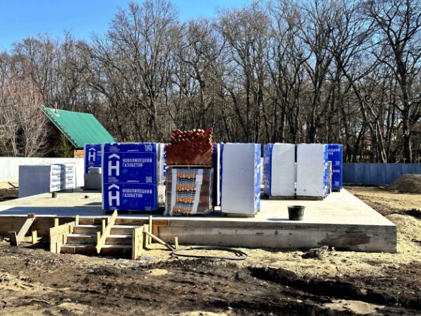 Здесь мы строили дом общей площадью 110 м² для молодой пары. Весна выдалась ранней. И как только столбик термометра уверенно пополз вверх, а снег сошел быстрее обычного, мы вышли на стройплощадку. Расставили материал, сделали гидроизоляцию, дальше — стены. Газобетон шел быстро, облицовочный кирпич — аккуратно, с расшивкой. Кстати, кому интересно, как строился этот дом — у меня на канале есть подробное видео стройки. Там весь процесс целиком.