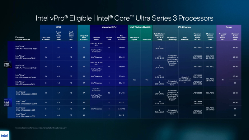 Наряду с Xeon 600, Intel представила процессоры Core Ultra Series 3 (ранее известные как Panther Lake) для бизнеса с сертификацией vPro. Линейка более компактна по сравнению с клиентской Core Ultra Series 3, но характеристики идентичны. Разница заключается в поддержке Intel vPro — наборе технологий для обеспечения безопасности, мониторинга и администрирования, что важно для рабочих ПК.