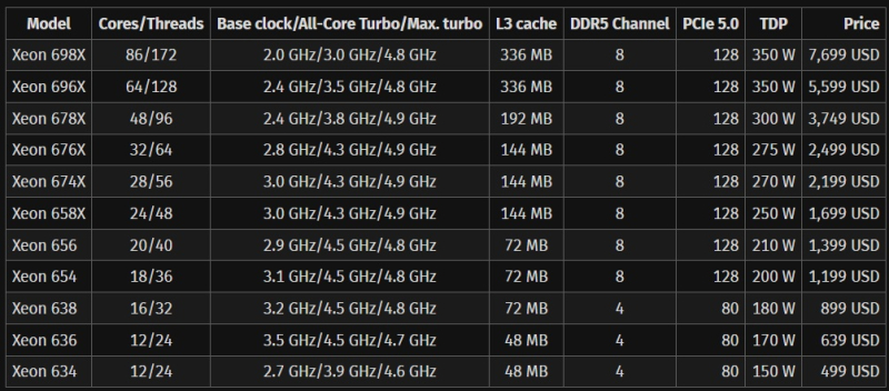 Intel пока не поделилась результатами тестов процессоров Xeon 600, по-прежнему опираясь на заявление о повышении производительности в многопоточных задачах до 61 % и в однопоточных задачах до 9 % по сравнению с процессорами Sapphire Rapids-WS предыдущего поколения.